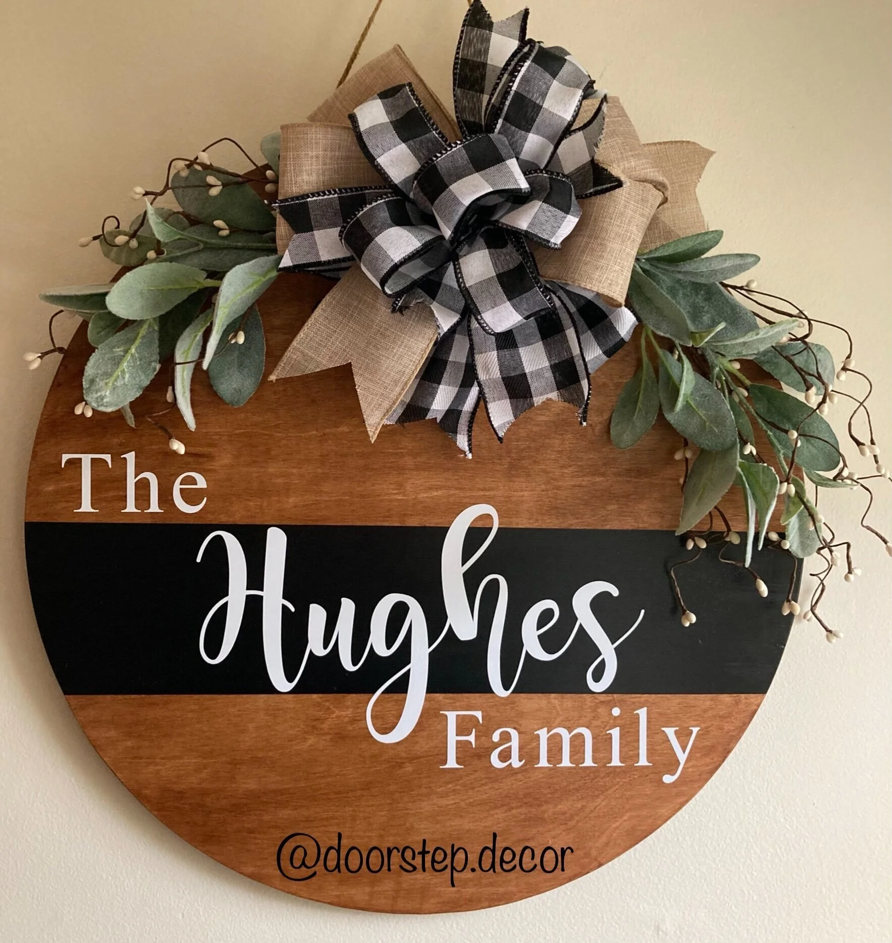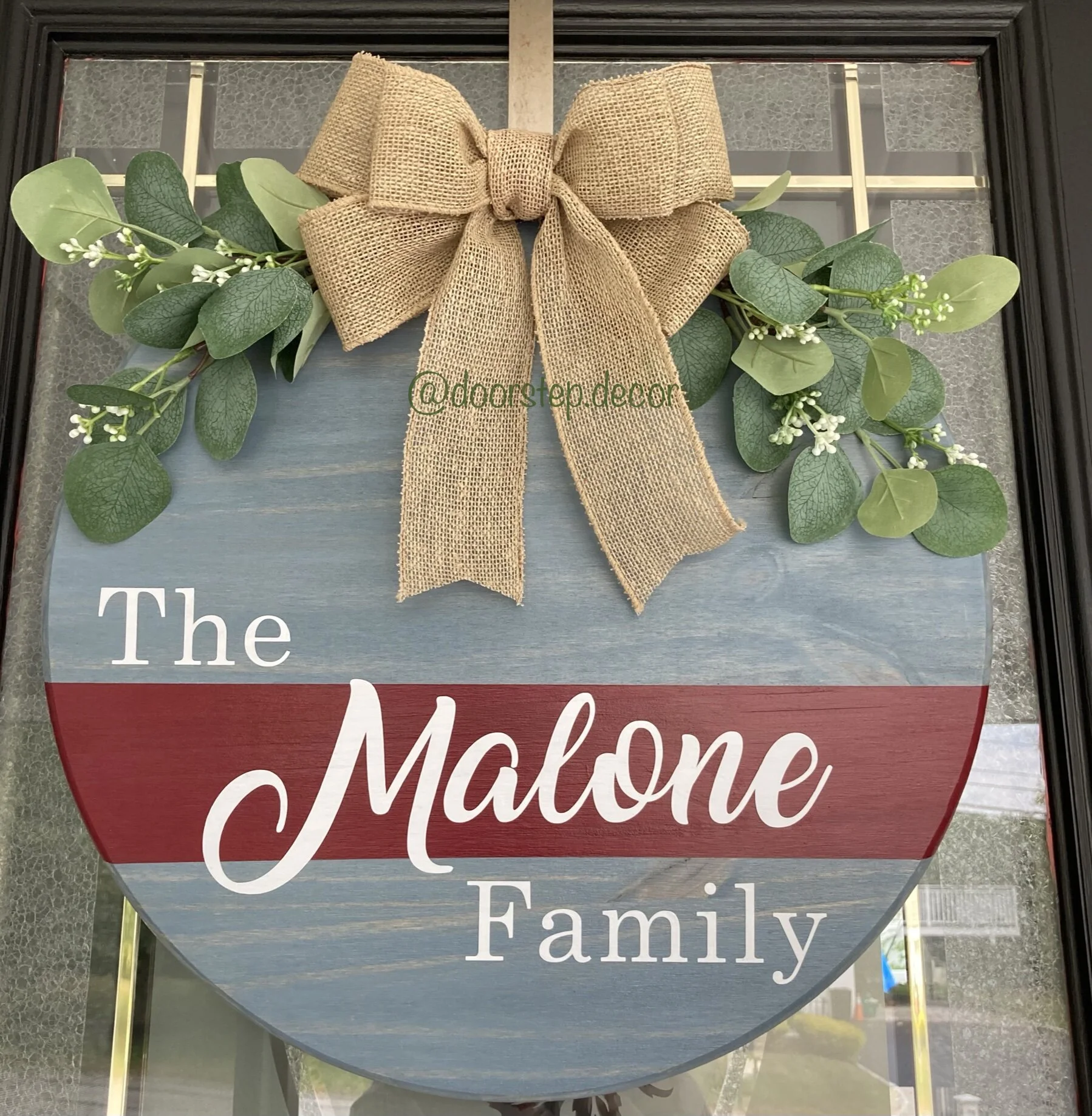 This sign is a beautiful way to display your family’s name. You choose your stain and paint color (optional). Signs are topped with your choice of florals and a full bow. Signs measure approximately 18”.